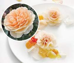 Роза Jordi Roca (Жорди Рока). Цветки абрикосового цвета, диаметром около 8 см, махровые (47 лепестков), старинного сложения. Аромат имеет оттенок апельсина. Названа в честь кондитера Жорди Рока. Вкус лепестков сладковатый, аромат сладко-апельсиновый. Лепестки крупные, поэтому их хорошо использовать для приготовления десертов и розовой воды. Также лепестки подойдут в качестве украшения для сладких блюд. Из лепестков получаются вкусные цукаты. Сушеные хороши как арома-добавка к чаю.