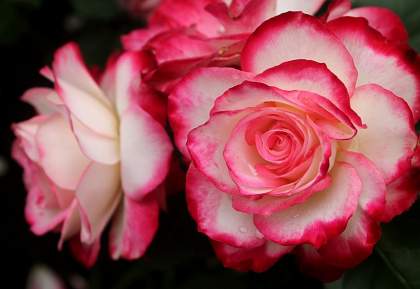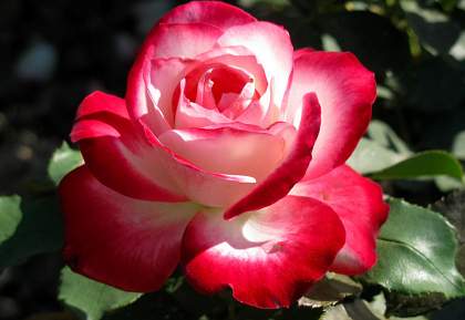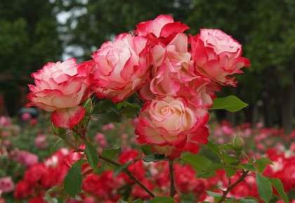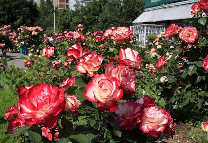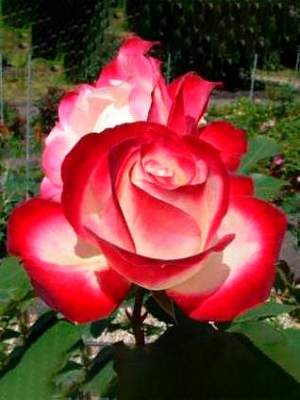 Роза флорибунда Jubile du Prince de Monaco (Жюбиле дю Пренс де Монако). Эта эффектная роза покоряет красотой цветка. В полуроспуске бело-кремовые лепестки окантованы нежной малиновой каймой, которая по мере раскрытия цветка расширяется, а ее интенсивность усиливается до вишневой.