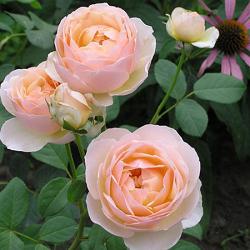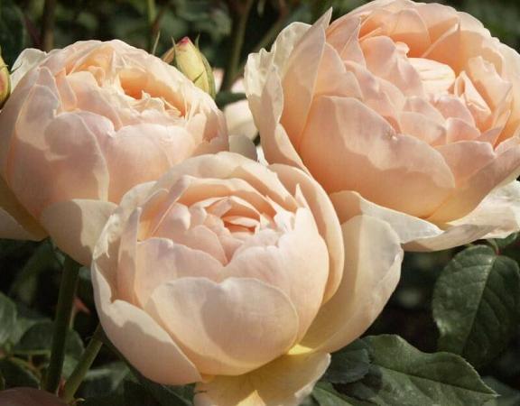 Роза Jude the Obscure (Джуд зе Обскур). Цветки очень крупные (14 см), округлой формы, похожи на махровые тюльпаны. Окраска великолепная — смесь нежно-абрикосового и сливочного в центре, с бледными кремово-белыми внешними лепестками. Они напоминают нежные тона чайных роз 19-го века.
