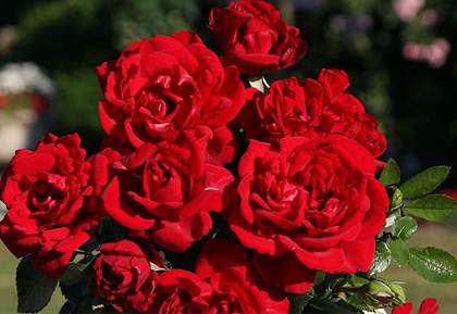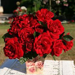 Роза Jugendliebe (Югендлибе). Цветки крупные (10 см), ярко-красные, чашевидные, махровые (около 30 лепестков), с легким ароматом, появляются из темно-красных бокаловидных бутонов. Лепестки красиво отгибаются. Цветки как одиночные, так и в небольших соцветиях на компактном кусте со средне-зеленой, глянцевой листвой. Сорт очень здоровый, устойчивый к болезням. Цветки держатся 10-12 дней.
