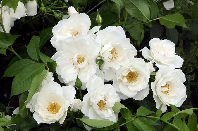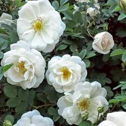 Роза Kakwa (Каква). Одна из лучших парковых роз. Гибрид розы спинозиссима. Цветки красивой формы, полумахровые, в соцветия. Белые с легким розоватым оттенком. Имеет сильный аромат. Цветет в июне, обильно. Листья очень устойчивы к болезням. Куст высокий, до 120 см, хорошо развитый. Легко растет в полутени, не требует специального ухода.