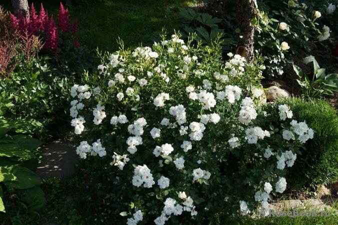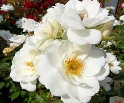 Роза White Cover (Вайт Каве). Цветки мелкие, полумахровые, чистого сияющего белого цвета, с легким ароматом. Цветет обильно и непрерывно небольшими кистями по всей поверхности растения до первых морозов. Цветки оттеняются мелкой темной аккуратной листвой, устойчивой к болезням. Куст низкий, раскидистый. Лучше выглядит в массовой посадке, хотя хорош и на переднем плане бордера и часто выращивается в контейнерах.