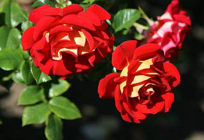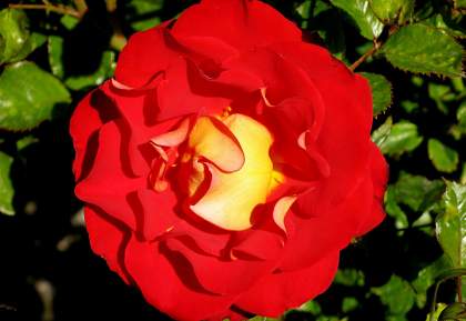 Роза Ketchup & Mustard (Кетчуп & Мастард). В переводе название означает "кетчуп и горчица". Цвет с обеих сторон лепестков очень плотный, что и делает розу совершенно уникальной. Бутоны стройные, заострённые. Ярко-красные цветки с горчично-желтым реверсом, умеренно-махровые (20-28 лепестков), в полуроспуске классической формы, затем — свободной чашевидной. Аромат чая и яблока. Лепестки закручены по спирали. Цветки не выгорают и держатся на кусте вплоть до следующей волны цветения. В более холодном климате размер цветков больше.