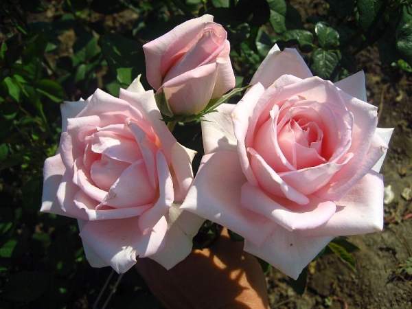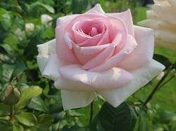 Роза Kopernik (Коперник). Чайно-гибридная роза. Цветки махровые, классической формы, светло-розовые, в полном роспуске — с палевым (лососёвым) оттенком. Цветки крупные, 10-12 см в диаметре, с нежным ароматом. При хорошей агротехнике размер отдельных цветков достигает 13 см. На побеге может быть от одного до пяти цветков.