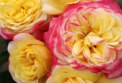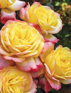 Роза Kordes Jubilee (Кордес Юбилее). Сорт создан к 125-летию фирмы Кордес. Густомахровые цветки с плотно набитой серединкой — желтые с ярко-розовыми или красными крайними лепестками. Интенсивный аромат с нотками ванили, гелиотропа и жасмина. Куст высокий, прямостоячий, с крепкими побегами. Сорт-шедевр!