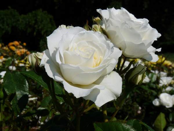 Роза Kristalpearl, Kristall (Кристалперл, Кристалл). Белые махровые цветы собраны в многочисленные соцветия. Цветение продолжается в течение всего сезона. И оно весьма обильное. Куст широкий, с тёмной зелёной листвой, высотой около 100 см.