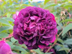 Цветение однократное. Высота куста 140-180 см. Вероятнее всего, это старинный гибрид роз галлика и центифолия. Цветки среднего размера, розетковидные, густомахровые, душистые, пурпурно-фиолетовые с лиловыми тонами и заметно более светлой обратной стороной лепестков. Кусты рослые, раскидистые с ярко-зеленой листвой.
