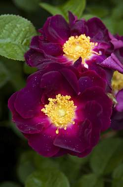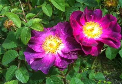 Роза La Belle Sultane (Ля Белль Султан). Простые или полумахровые темно-фиолетовые цветки с ярким желтым пучком тычинок в центре и сильным ароматом. Цветки до 10 см в диаметре. Крупная средне-зеленая матовая листва с пятью листовками. Зимостойка — четвертая зона. Высокая устойчивость к мучнистой росе и черной пятнистости. Теневыносливый сорт.