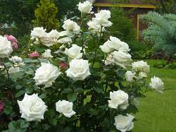 Цветки махровые, бутоны элегантные, раскрываются медленно и долго держат форму, кремовые с лимонным центром, позднее чисто-белые, устойчивы к дождю.