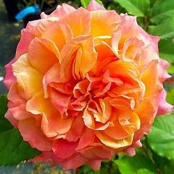 Цветки крупные, вначале бутон как у классической чайно-гибридной розы, затем превращается в шикарную крупную золотист-оранжевую розу старинного типа. Цветок густо-махровый, сияющий, долго держится на кусте.