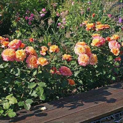 Роза La Villa Cotta (Ля Вилья Котта). Роза из коллекции "Сказочные розы". Цветки очень красивой правильной формы на всех стадиях роспуска, диаметром 8-10 см, в центре жёлтые с медным отливом, с розовыми внешними лепестками, с мягким, нежным ароматом. Со временем цветовая палитра цветка меняется — в нём усиливается интенсивность розовых тонов, а желтая окраска, наоборот, становится бледнее. Погода тоже может вносить свою лепту в окраску цветка: в прохладную погоду наружные лепестки с внешней стороны приобретают кирпичный оттенок, а внутренние осветляются до кремово-медных, что в целом придаёт цветку очень красивую, переливчатую окраску.