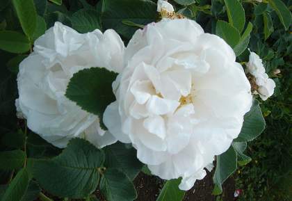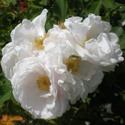 Роза Lac Majeau (Лак Межу). Гибрид розы ругозы (R. rugosa). Бутоны с розово-красными полосками. Цветки диаметром 8 см, полумахровые белые с жёлтыми тычинками, в соцветиях по 3-5. Аромат сильный.