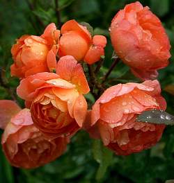 Роза Lady Emma Hamilton (Леди Эмма Гамильтон). До того как бутоны раскроются, внешние лепестки темно-красные с оранжевыми штрихами. Полностью раскрывшиеся цветки практически мандаринового цвета с внутренней стороны лепестков, и более желтые с внешней стороны; все это на фоне очень темных, бронзового цвета листьев, которые очень медленно зеленеют с возрастом.