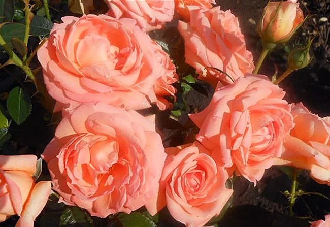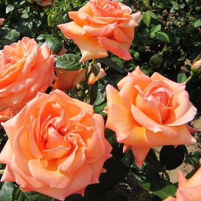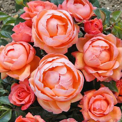 Роза флорибунда Lady Marmalade (Леди Мармелейд). Округлые бутоны раскрываются в глубоко-чашевидные старинные цветки насыщенного мандаринового цвета с глубоко-разрезанными лепестками. Листва светло-зеленая, глянцевая. Цветение обильное в кистях, продолжительное.