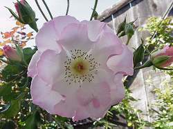 Роза Lady of the Dawn (Леди оф зе Дон). Очень обильно цветущая флорибунда. Цветки полумахроыве, около 8 см в диаметре, нежно-розовые с желтым. Венчики плоские, с золотистым пучком тычинок в центре. Практически без запаха. Цветет все лето и осень. Куст быстрорастущий. Листья плотные, вначале красноватые, затем оливково-зеленые.
