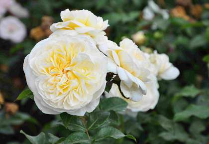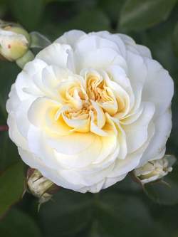 Роза Lady Romantica (Леди Романтика). Полумахровые бутоны розы Lady Romantica (Леди Романтика) состоят из округлых лепестков, количество которых превышает 25. Собранные в соцветия по 3-5 штук цветки, белые с медовым центром, практически единовременно зацветают, образуя объемный, сладостно благоухающий, островок. Диаметр цветка при полном раскрытии около 9 см.