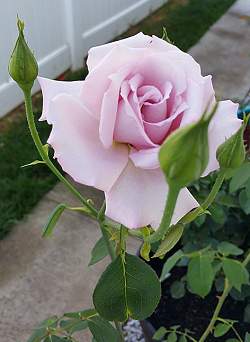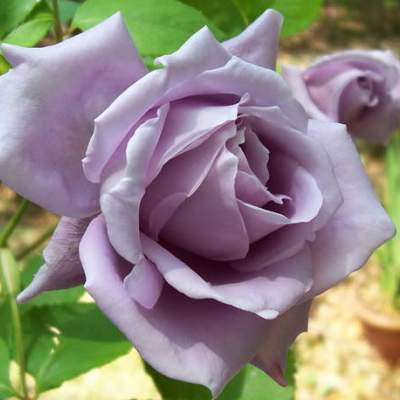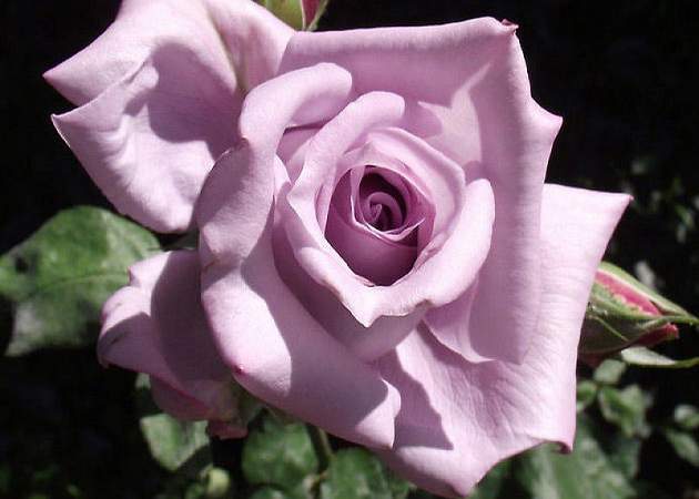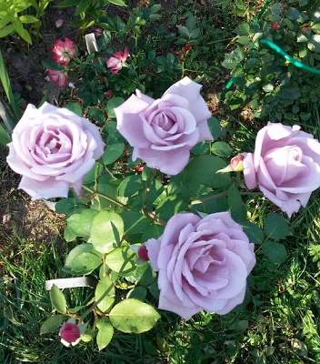 Роза Lady X (Леди Икс). Бутон красивой бокаловидной формы, с высоким центром. Цветы розовато-лиловые, с голубым или сиреневым оттенком, крупные (10-12 см), умеренно-махровые (17-25 лепестков), одиночные. Побеги сильнорослые. Листья темно-зеленые, крупные, глянцевые.