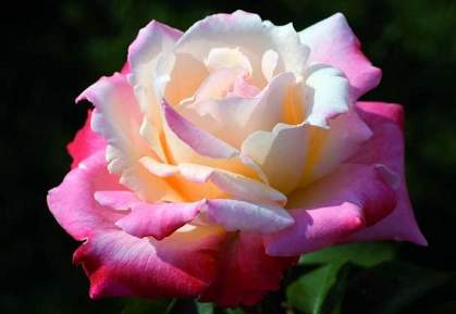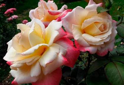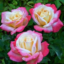 Роза чайно-гибридная Laetitia Casta (Летиция Каста). Роза великолепная. Цветки классической формы состоят из 25-28 лепестков, кремовые с нежно-розовым румянцем по краям. Аромат легкий, классический, розового масла.