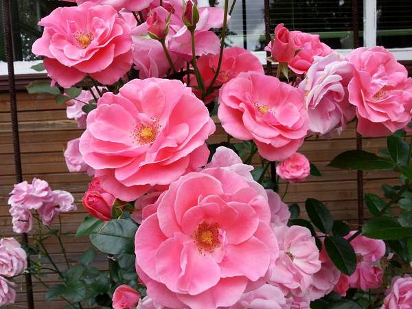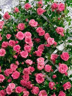 Роза Lawinia (Лавиния). Одна из лучших современных плетистых роз. Цветки у Lawinia ярко-розовые, очень чистого оттенка, слегка бледнее по краям и темнее к центру цветка. Элегантные бутоны раскрываются в чашевидные цветки в крупных рыхлых кистях до 7 шт. Цветение очень обильное, так что растение в цвету полностью покрыто крупными, ароматными, цветками, которые не боятся дождя. Листва крупная, среднего зеленого цвета.
