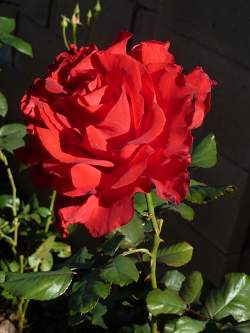 Цветки необычайно большие, вплоть до 20 см, махровые, элегантной бокаловидной формы, плотного яркого рубиново-красного с намёками на черное дерево цвета. Количество лепестков цветка — 30 шт. Аромат фруктовый. Продолжительное цветение. Каждый цветок держится очень долго, медленно распускаясь. Побеги тонкие, но крепкие, шипов мало.
