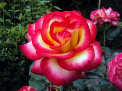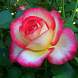 Роза Leo Ferre (Лео Ферре). Цветок желто-розовый с ярко-малиновой каймой, махровый, диаметр цветка 11 см, с высоким центром, обладает легким ароматом. Цветение обильное, повторное. Особенность сорта в том, что второе цветение буквально роскошное.
