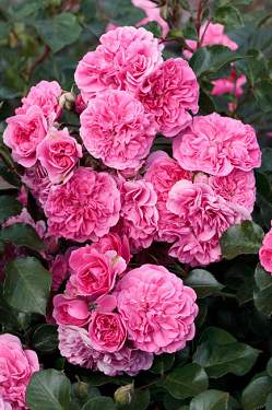 Цветки крупные, густомахровые, глубокого розового цвета, появляются в больших кистях, устойчивы к дождю. Непрерывное цветение в течение всего сезона.