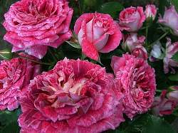 Роза Let's Celebrate (Летс Селебрейт). Очаровательная флорибунда с интересной окраской цветков. Лепестки серебристо-белые, покрытые фиолетово-лиловыми штрихами и пятнам в почти сюрреалистической комбинации. Цветки среднего размера, махровые (17-25 лепестков), с красиво расположенными лепестками, очаровательные, взъерошенные на вид, ароматные, в больших соцветиях. Цветение обильное. Кусты аккуратные, густые, плотно покрыты листвой.