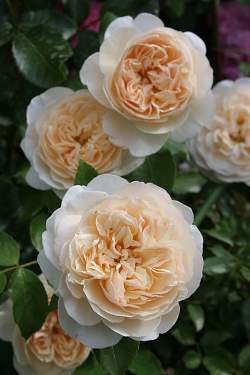 Роза Lichfield Angel (Личфилд Энджел). Персиково-розовые бутоны постепенно распускаются в аккуратные чашевидные розетки. Каждый цветок представляет собой идеальный круг кремово-абрикосовых плотных восковых лепестков, окружающих мелкие внутренние лепестки. Со временем внешние лепестки отгибаются вниз, образуя огромный помпон кремово-белого цвета. В массе цветок выглядит почти чисто белым.