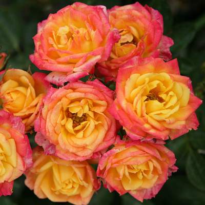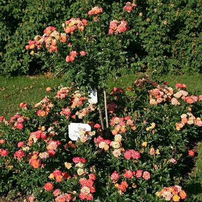 Роза Little Sunset (Литтл Сансет). Цветки диаметром 3 см, махровые (17-25 лепестков), элегантные, жёлтые с красной каймой. Цветение повторное. Листва высокоустойчива к чёрной пятнистости и к мучнистой росе. Куст гармонично развитый, высотой 40 см, шириной 40 см. Золотая и бронзовые медали на международных выставках и конкурсах роз.