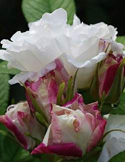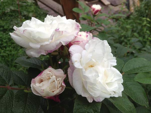 Роза Louise Bugnet (Луиза Багнет). Белые, с легкой зеленцой, махровые чашевидные цветки появляются в небольших соцветиях из вишневых бутонов.