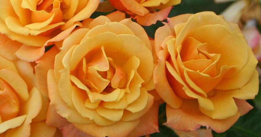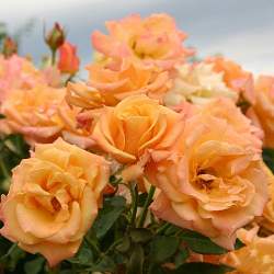 Роза Lusatia (Лузатия). Цветки полумахровые, диаметром 7-8 см, медно-абрикосовые с золотистым оттенком, собираются в небольшие соцветия. При распускании внешние лепестки становятся красноватыми. Аромат лёгкий. Цветение повторное. Куст высотой 70 см, шириной 50 см, прямостоячий. Листва устойчива к заболеваниям.