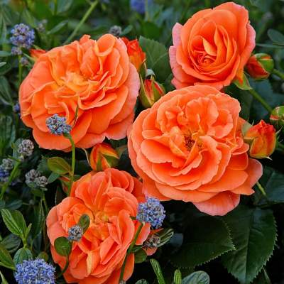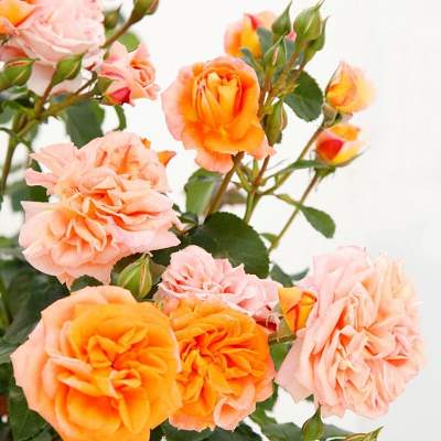 Роза Mango (Манго). Обильноцветущий сорт. Цветки диаметром 5-6 см, махровые, при раскрытии ярко-оранжевые, затем быстро меняют окраску на бледно-оранжевую. Аромат лёгкий, фруктовый. Цветение повторное в течение сезона. Листва высокоустойчивая к чёрной пятнистости и мучнистой росе.