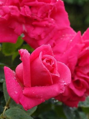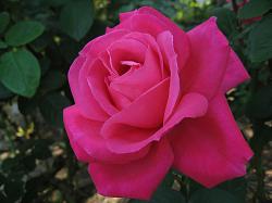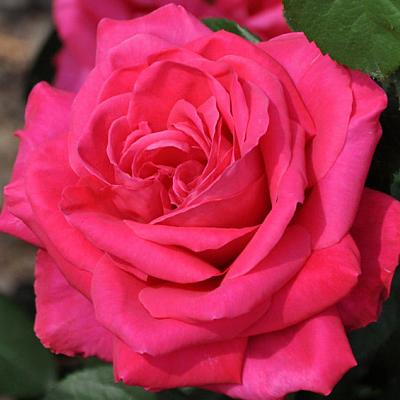 Роза чайно-гибридная Maria Callas (Мария Каллас). Крупные цветки насыщенно-розового цвета из 50-60 лепестков, с сильным ароматом, классической формы чайно-гибридной розы с высоким центром, на побегах в основном одиночные. Куст вертикальный, с прочными побегами и ярко-зеленой матовой листвой.