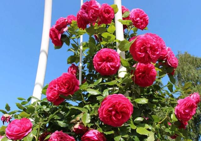 Роза плетистая Maritim (Маритим). Превосходная роза. Очень яркая, заметная, не выгорает. Бутоны шаровидные, распускаются в почти плоские розетки, набитые лепестками. Серединку не показывается, цветки смотрят вверх. Побеги сильные, нарастает быстро. Листья здоровые, блестящие.