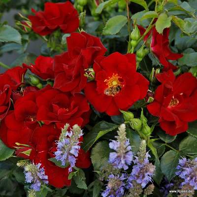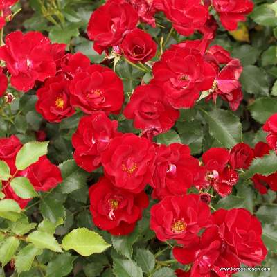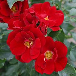 Роза почвопокровная Marondo (Марондо). Цветки диаметром 5-6 см, полумахровые (9-16 лепестков), тёмно-красные, бархатные, в небольших соцветиях, устойчивые к дождю. Цветение обильное, повторное. Листва полностью устойчивая к мучнистой росе, устойчивая к чёрной пятнистости. Куст высотой 70 см и шириной 60 см. Цветки прекрасно держат дождь.
