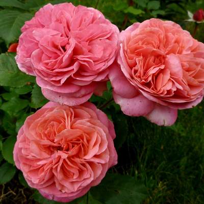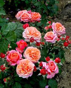 Роза Mary Ann (Мэри Энн). Прекрасная роза — очень красивая и зимостойкая. Цветовая гамма немного необычна и сочетает в себе оранжевые, розовые и пурпурные оттенки. Чашевидные цветки диаметром около 10-12 см, плотно набиты примерно 80 лепестками. В период полного роспуска лепестки слегка отгибаются наружу и образуют, как правило, квартированный цветок розетковидной формы. Эти крупные цветы собраны в небольшие соцветия до 5 штук и благоухают приятным, ярко выраженным фруктовым ароматом с цитрусовыми нотками.