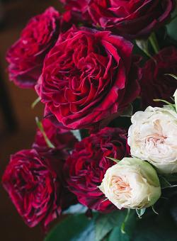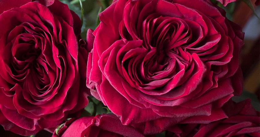 Роза Mayra's Red (Майрас Ред). Красавица! Цвет глубоко-красный, текстура лепестков бархатистая. Форма цветка розетковидная, лепестки гофрированные. Размер цветков до 10 см. Отлично стоит в срезке больше 10 дней. Цветение повторное в течение сезона. Листва устойчивая к заболеваниям. Куст высотой 70-80 и шириной 40-50 см. Отличная устойчивость к дождям.