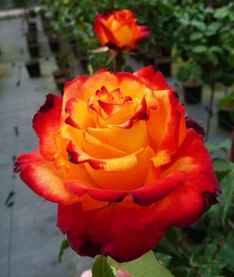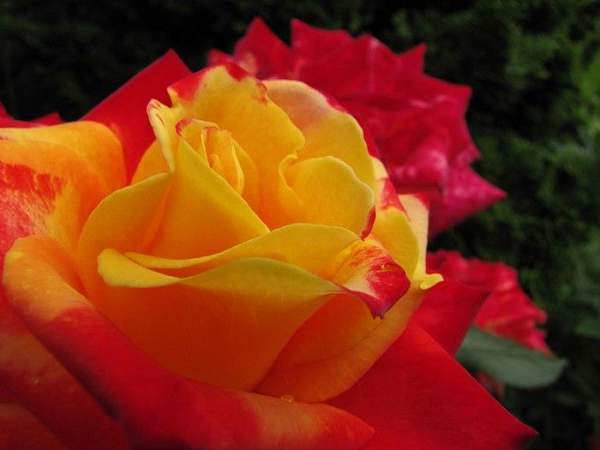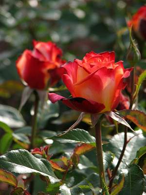 Роза флорибунда Mein Muenchen (Майн Мюнхен). Классический бутон чайно-гибридной розы в полуроспуске, в полном роспуске — свободной чашевидной формы. Цветок желтый с ярко-красной каймой по краю лепестков, умеренно-махровый, расцветая, показывает серединку. Листва темно-зеленая, глянцевая.