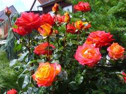 Невысокий куст красивой пропорциональной формы. Цветет постоянно, самоочищается, цветки держатся долго. К осени немного меняется окраска: уходит в красный. Ничем не болеет. Роза без недостатков.