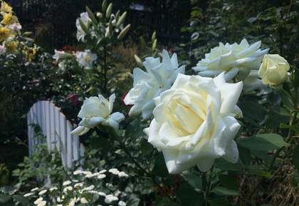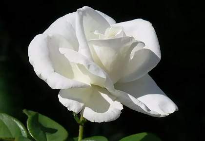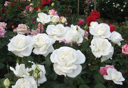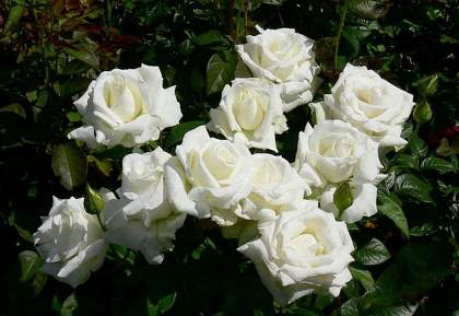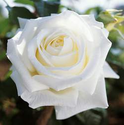 Роза чайно-гибридная Metropolitan (Метрополитан). Цветки белые, махровые, 28-40 лепестков, классической формы с высоким центром, на побегах в основном одиночные, с насыщенным ароматом фруктов с нотками банана, абрикоса, персика и лилии. Куст вертикальный, высокий, густооблиственный, листва темно-зеленая, полуглянцевая.