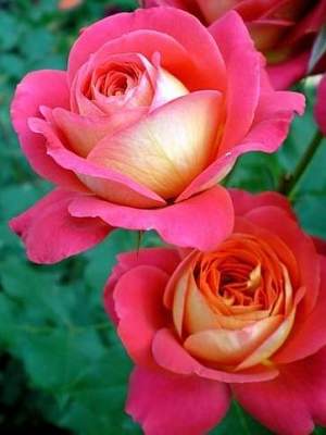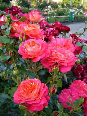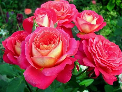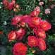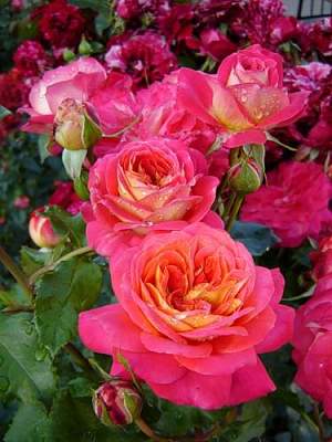 Роза Midsummer (Мидсаммэ). Выразительный сорт. Цветки средних размеров, насыщенного оранжево-красного цвета с желтой изнанкой лепестков, густомахровые, квартированные. Появляются в небольших кистях на крепких цветоносах. Цветет очень обильно, продолжительно. Цветок не повреждается дождем. Очень выносливая здоровая роза.