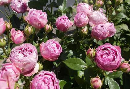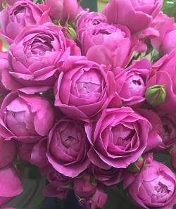 Роза Misty Bubbles (Мисти Баблз). Спрей-роза. Цветки диаметром 7-8 см, густомахровые (60-70 лепестков), сиренево-фиолетовые, в соцветиях от 5 до 15 шт., хорошо переносят дождь и жару. Цветение повторное в течение сезона. Листва устойчивая к заболеваниям. Шипов мало. Куст высотой 60-80 см.