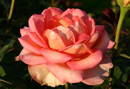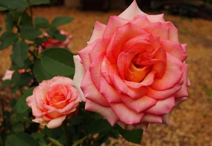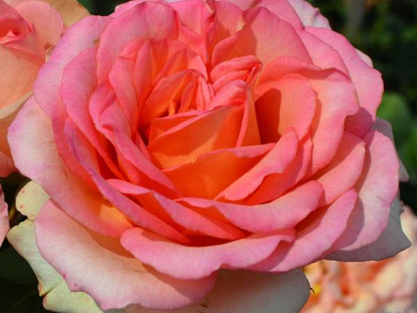 Роза чайно-гибридная Mondiale (Мондиаль). Бутоны этой розы сливового цвета, распускаются в кораллово-розовые в центре цветки с желтыми полутонами у основания лепестков. Появляются все лето и осень. Устойчивая к жаре и дождю, цвет яркий. Лепестки толстые, кораллово-розовые. Дождь не замечают, с возрастам выгорают по краям до очень светлого.
