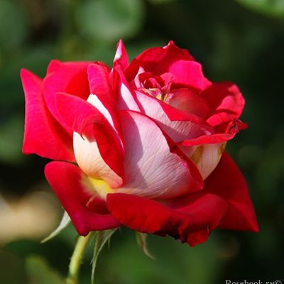 Яркая высокая роза с сильномахровыми чашевидными цветами двуцветной окраски - карминово-розовый со сливочно желтым реверсом. Аромат сильный с анисово-перечными нотами. Обладает высокой ремонтантностью. Куст пряморослый с большими матовыми листьями. Бутон: кремовый с малиновыми полосами, округлый.