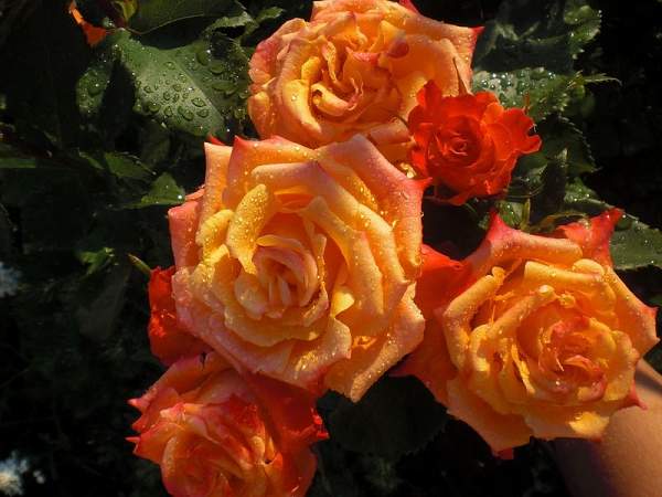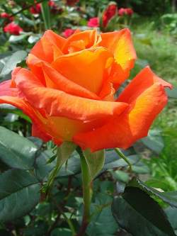 Роза чайно-гибридная Monica (Моника). Monika — очень яркая красно-желтая чайно-гибридная роза. Цветки наиболее яркие когда только начинают распускаться. Ярко-оранжево-алые лепестки контрастируют с желтой изнанкой.
