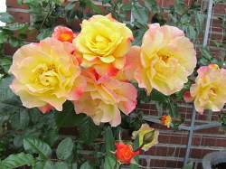 Роза Moonlight (Мунлайт). Очень сильнорослый и выносливый сорт, хорошо разветвленные побеги усыпаны ароматными абрикосово-розовыми цветками. Медно-желтые бутоны раскрываются в полумахровые медно-желтые цветки, которые выгорают до желтых и приобретают розовый оттенок. Цветки в кистях по 4-6 шт. Куст густооблиственный, ветвистый, до 2 м. Листва темно-зеленая, очень блестящая.