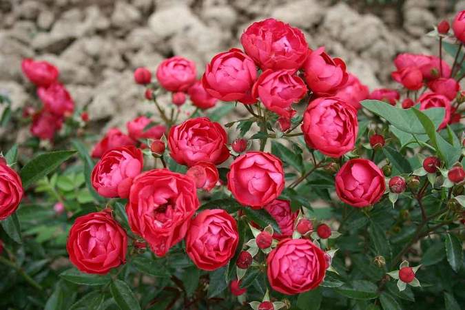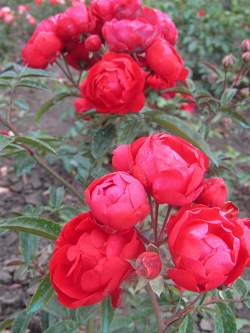 Роза полиантовая Morsdag (Морсдаг). Отлично зимует даже без укрытия и обильно цветет. Мини-пейзажная розочка со своим обаянием. Отлично смотрится как подсадка к более крупным сортам или в качестве почвопокровной. Цветки красные, шаровидные, собраны с большие соцветия. Цветение непрерывное. Куст высотой и шириной 50 см. Все, кто раз видел Морсдаг, влюбляются в нее.