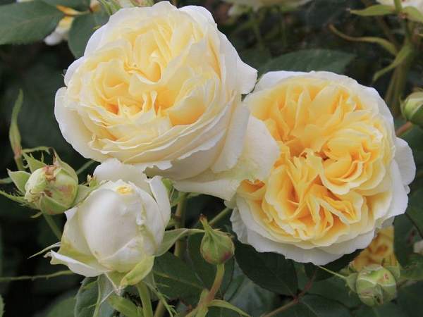 Роза My Girl (Май Гёл). Кремово-желтая чайно-гибридная роза с крупными густомахровыми цветками в старинном стиле, лепестки резные. Цветки появляются в небольших соцветиях, долго не увядают и чудесно контрастируют с темно-зеленой блестящей листвой. Куст округлый, ветвистый. Классический аромат розового масла.