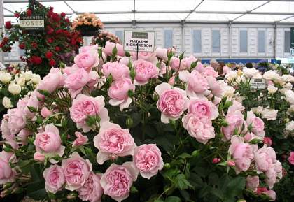 Роза Natasha Richardson (Наташа Ричардсон). Удивляет обильным и продолжительным цветением. Чашевидные цветки диаметром около 8 см и состоят примерно из 30-40 лепестков, которые слегка отгибаются наружу и обнажают пучок золотистых тычинок.
