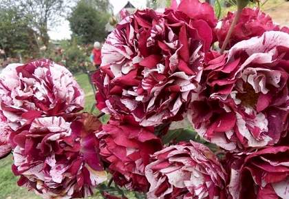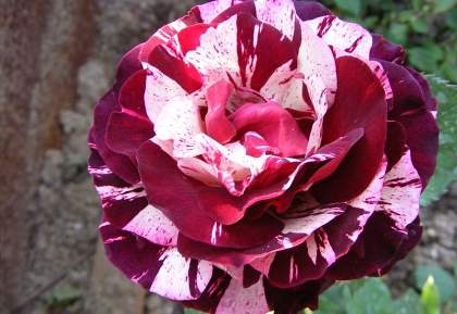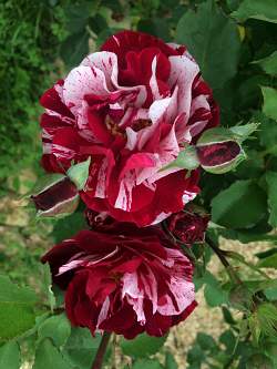 Роза New Imagine (Нью Имэджин). Кремово-сиреневые с фиолетово-малиновыми, бордовыми, красными полосками и пятнами цветки, чашевидной формы, средне-махровые (17-25 лепестков), в полном роспуске показывают серединку, собраны в соцветия на прямостоячих побегах, отливающих пурпуром, обладают насыщенным ароматом. Куст компактный, с глянцевой, темно-зеленой листвой.